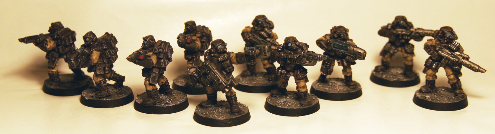 Ces 3 escouades sont composées de deux séries de figurines différentes. La première est constituée de 12 Kasrkins (dont 1 sergent et les 4 armes spéciales disponibles). Les deux suivantes sont des figurines des troupe de choc de 2003 (sans les câbles d’alimentation des fusil laser radiant) et sont constituées de 10 figurines chacune, chaque escouade ayant ses 2 armes spéciales (2 lance flammes et 2 lance plasma). J’aurai pu glisser quelques très anciennes références (celles avec les bérets) mais ces figurines font déjà partie d’autres escouades au sein de mes troupes.